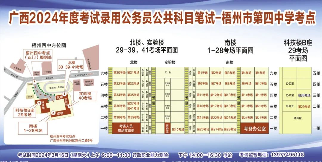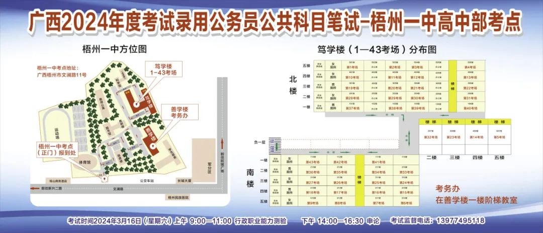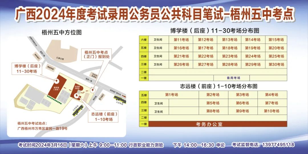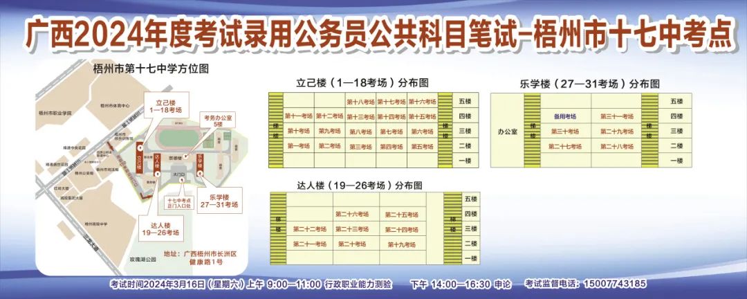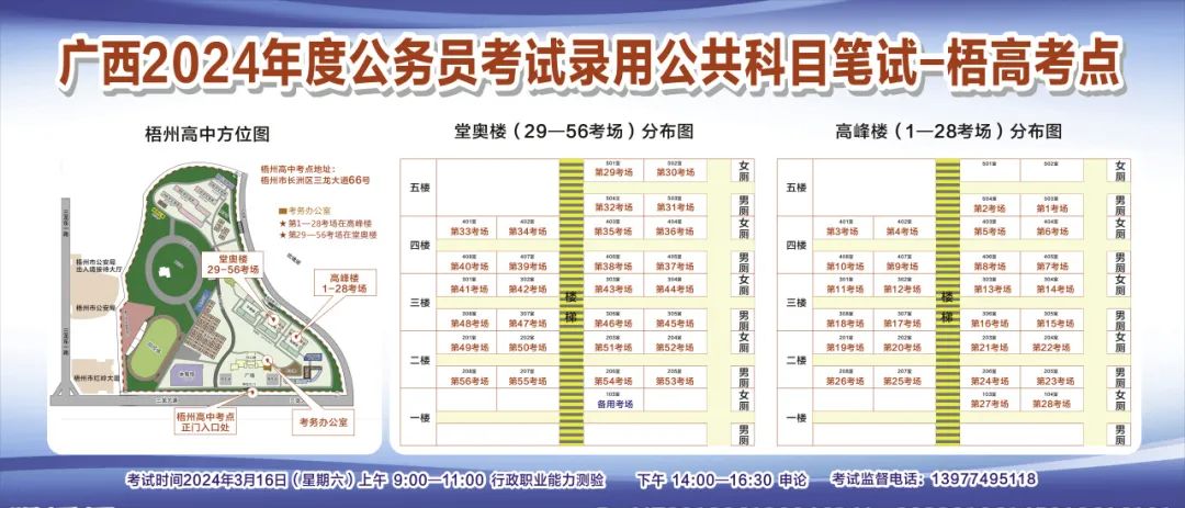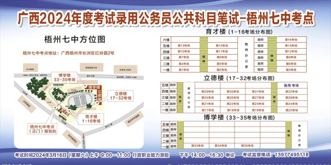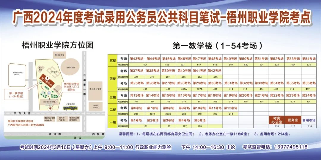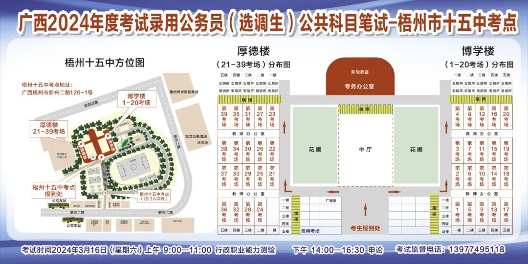 一、廣西2024年度考試錄用公務(wù)員(選調(diào)生)公共科目筆試將于3月16日舉行,梧州考區(qū)共設(shè)置9個(gè)考點(diǎn),請(qǐng)考生提前熟悉各自考點(diǎn)位置、周邊環(huán)境及交通情況,考試當(dāng)天提前出門(mén)做好準(zhǔn)備,準(zhǔn)時(shí)參加考試。特別提示:因考點(diǎn)停車場(chǎng)地有限,所有考生車輛不得進(jìn)入考點(diǎn),請(qǐng)考生規(guī)劃好前往考點(diǎn)的交通方式和路線。