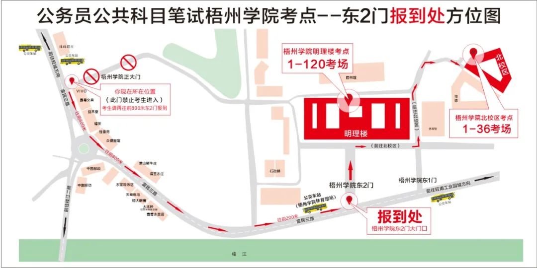 公交車參考:乘坐10路、32路、49路、49路延長(zhǎng)線、蒼梧城鄉(xiāng)6路到梧州學(xué)院體育館站,下車后步行約200米到達(dá)梧州學(xué)院東大門(mén)??忌y(tǒng)一在梧州學(xué)院東大門(mén)進(jìn)入,考點(diǎn)門(mén)口處于交通干道,送考車輛只能在東門(mén)外短暫停留,梧州學(xué)院南門(mén)及其他門(mén)無(wú)法核驗(yàn)考生身份。從東大門(mén)進(jìn)入明理教學(xué)樓考點(diǎn)考場(chǎng)步行約5分鐘,進(jìn)入北校區(qū)教學(xué)樓考點(diǎn)考場(chǎng)步行約15分鐘,請(qǐng)規(guī)劃好進(jìn)入考點(diǎn)時(shí)間。