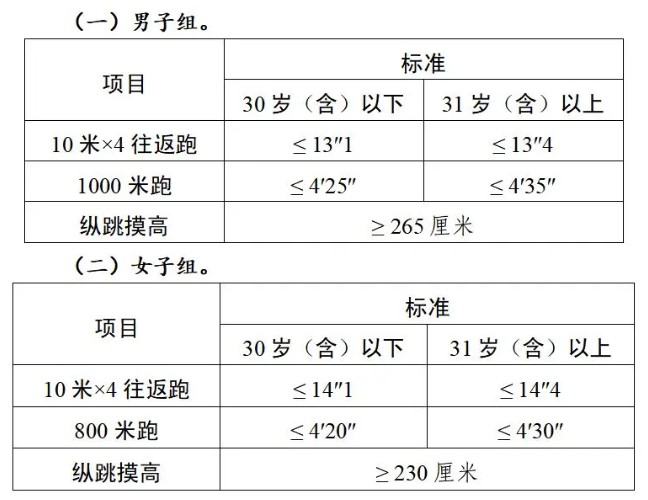 體能測評三項全部達(dá)標(biāo)方為合格。其中:縱跳摸高的測試次數(shù)不超過3次,10米×4往返跑的測試次數(shù)不超過2次,1000米跑/800米跑的測評次數(shù)為1次。