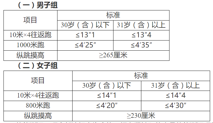 體能測評三項(xiàng)全部達(dá)標(biāo)方為合格。報(bào)考緊缺職位人員體能測評項(xiàng)目三項(xiàng)中有兩項(xiàng)達(dá)標(biāo)的,視為合格。體能測評項(xiàng)目中,縱跳摸高項(xiàng)目的測評次數(shù)不超過3次,10米×4往返跑項(xiàng)目的測評次數(shù)不超過2次,男子1000米跑、女子800米跑項(xiàng)目的測評次數(shù)為1次。