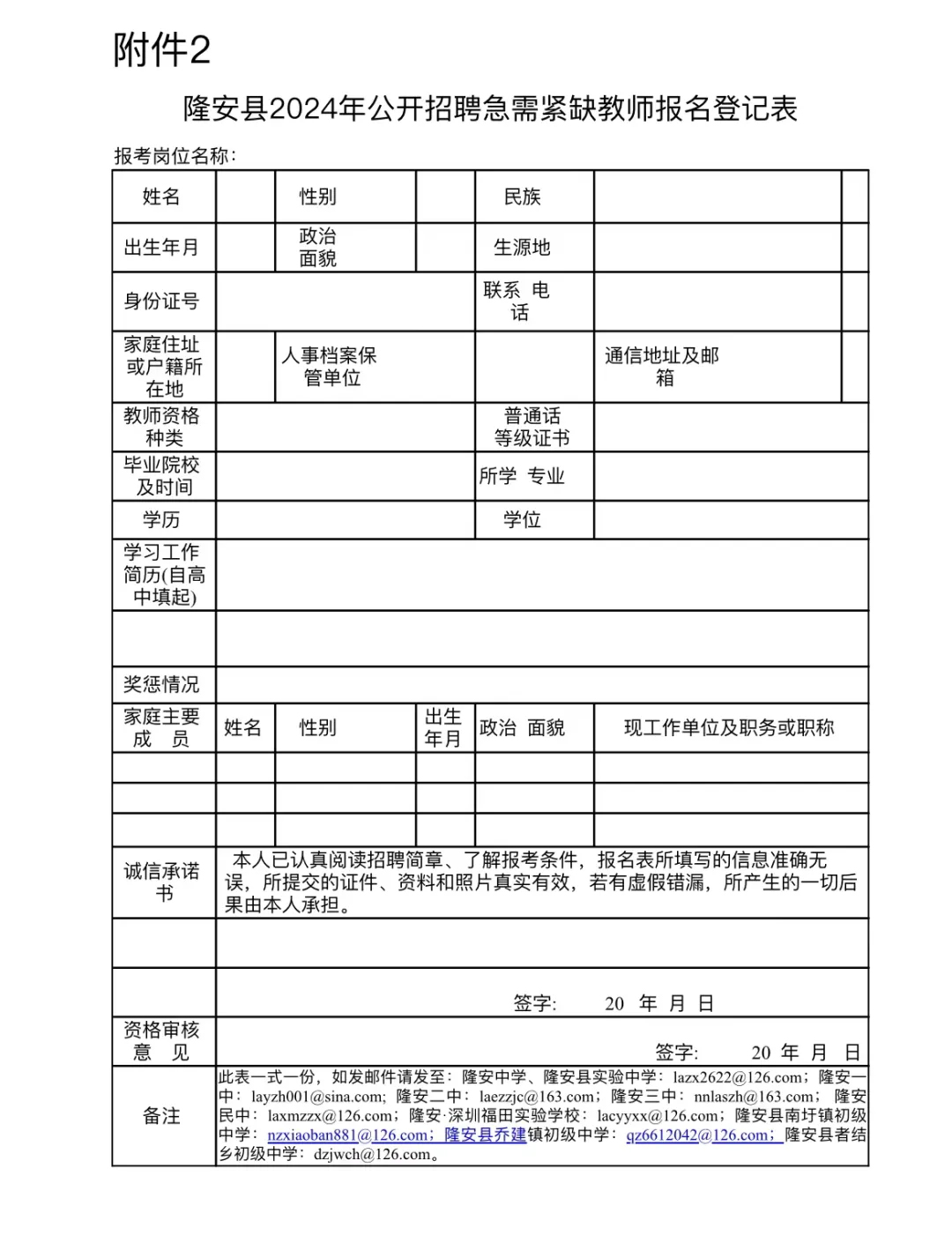(1)“隆安縣2024年公開招聘急需緊缺教師報(bào)名登記表”電子版。可登錄廣西南寧市人力資源和社會(huì)保障局網(wǎng)站、廣西南寧市隆安縣人民政府門戶網(wǎng)站、隆安縣民族中學(xué)微信公眾號下載。