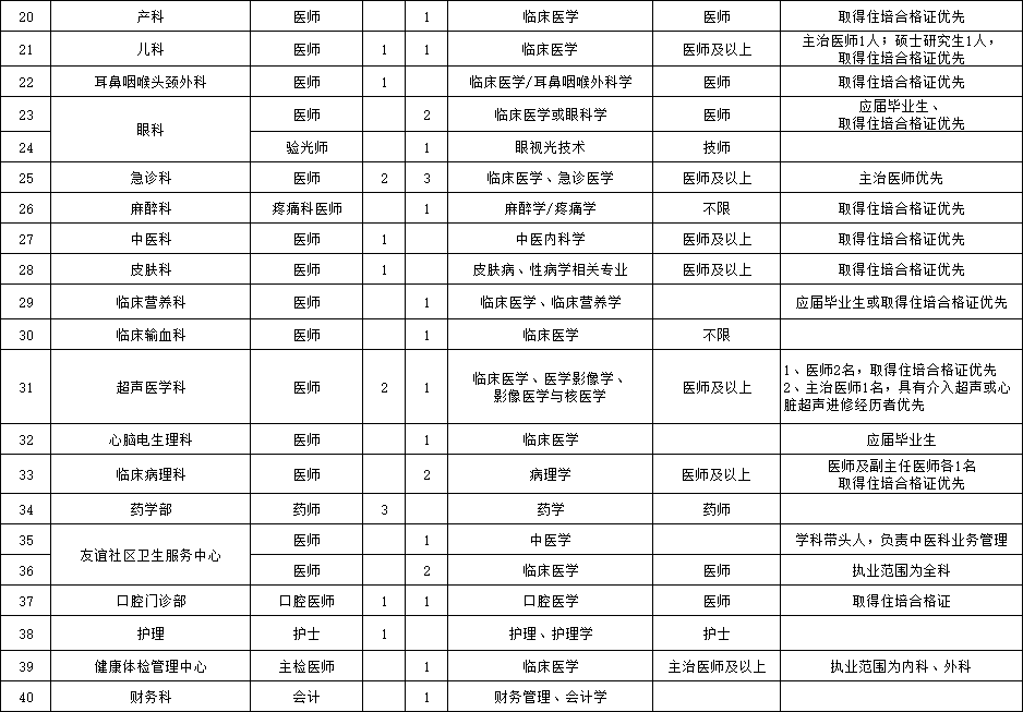 (五)應聘人員除具備以上基本條件外,還應符合招聘崗位所要求的資格條件;醫(yī)院緊缺專業(yè)((緊缺急需專業(yè):重癥醫(yī)學科、全科醫(yī)學科、康復醫(yī)學科、感染性疾病科、急診科、兒科、麻醉科、眼科、皮膚科、病理科、心腦電生理科等)人才可適當放寬條件。