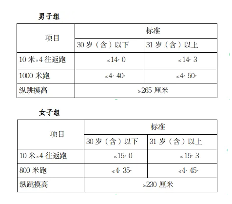 參照《關(guān)于印發(fā)公安機關(guān)錄用人民警察體能測評項目和標(biāo)準(zhǔn)(暫行)的通知》(人社部發(fā)〔2011〕48號)的項目及測試規(guī)則,結(jié)合《公安民警體育鍛煉達(dá)標(biāo)手冊》成績標(biāo)準(zhǔn),本次體能測評的項目和標(biāo)準(zhǔn)如下: