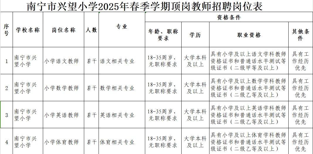 2025年南寧市興望小學(xué)春季學(xué)期頂崗教師招聘公告