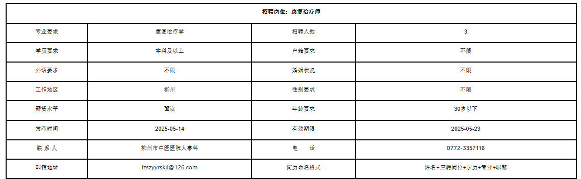 2025年廣西柳州康復治療師招聘3人