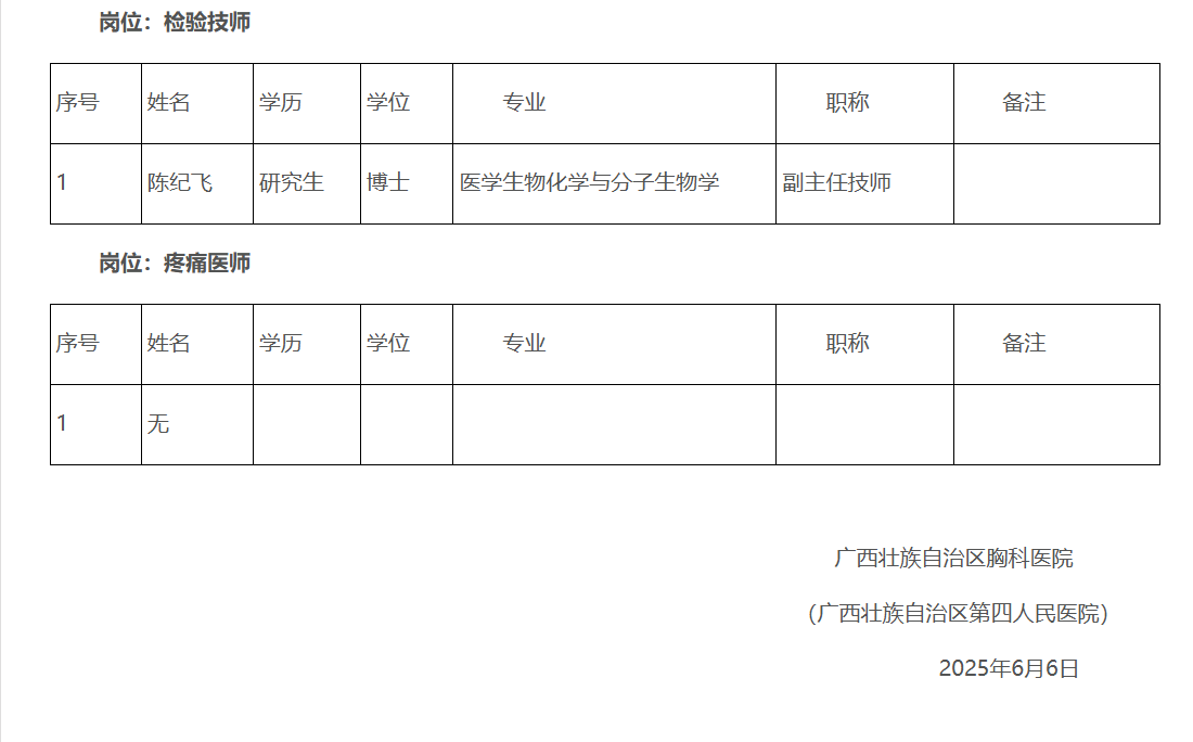 根據(jù)《自治區(qū)胸科醫(yī)院2025年度高層次人才公開招聘實名編制工作人員公告》要求,現(xiàn)將自治區(qū)胸科醫(yī)院2025年度高層次人才公開招聘實名編制工作人員報名通過資格審查人員名單公布如下: