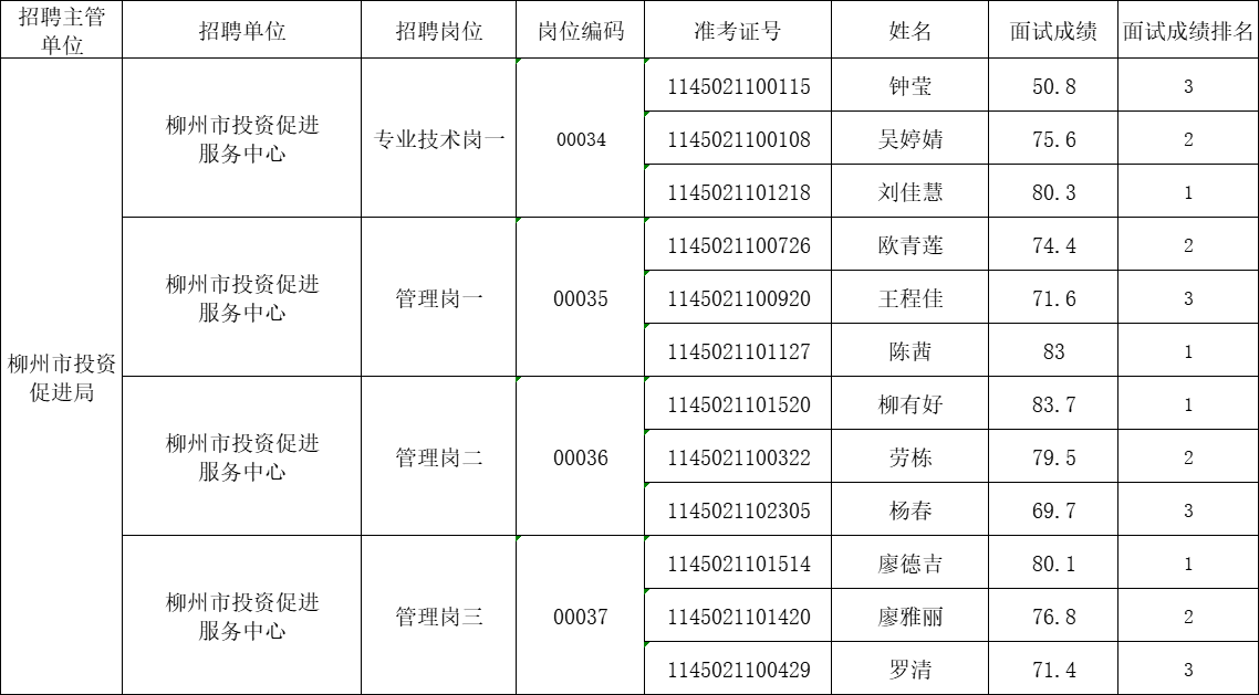 2025年柳州市投資促進(jìn)局所屬事業(yè)單位公開招聘工作人員面試成績(jī)公示