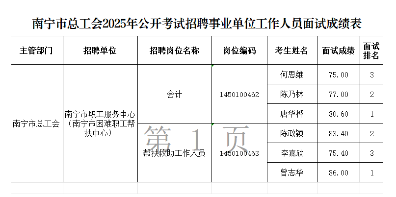 南寧市總工會2025年公開考試招聘事業(yè)單位工作人員面試成績表