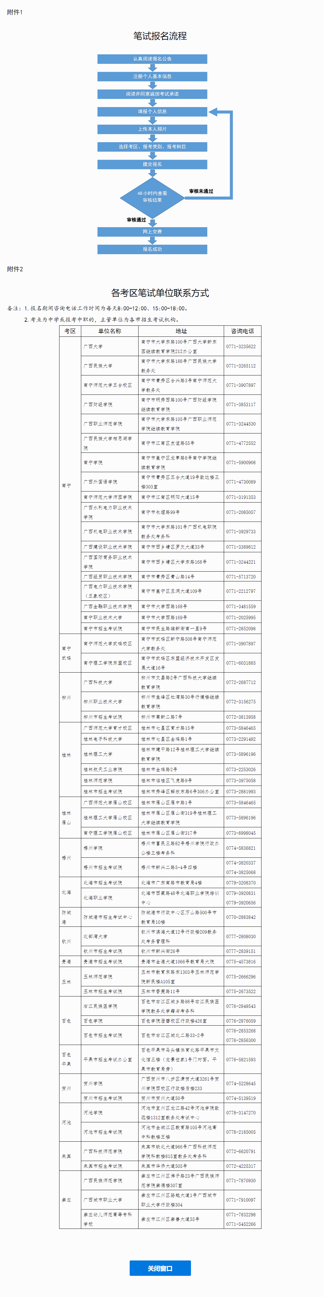 (一)有關(guān)此次考試的信息將在“中小學(xué)教師資格考試”網(wǎng)站、“廣西招生考試院”網(wǎng)站、“柳園清風(fēng)”微信公眾號、“廣西中小學(xué)教師資格考試考生自助平臺”上發(fā)布,請考生密切關(guān)注。其他未盡事宜,可聯(lián)系各筆試單位咨詢。