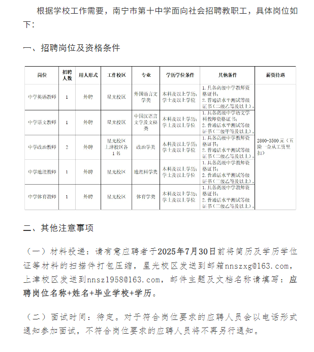 2025年南寧市第十中學(xué)招聘啟事