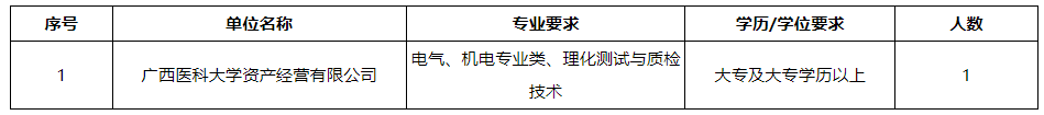 廣西醫(yī)科大學資產(chǎn)經(jīng)營有限公司(以下簡稱公司)是由廣西醫(yī)科大學于2011年8月3日獨資設立,經(jīng)營管理廣西醫(yī)科大學經(jīng)營性國有資產(chǎn)和對外投資的股權(quán)。公司依托學校和附屬醫(yī)院的資源優(yōu)勢,圍繞醫(yī)藥、養(yǎng)老、醫(yī)學檢驗、大健康項目等領域開展投資與合作,積極探索產(chǎn)學研協(xié)同發(fā)展。根據(jù)工作需要,現(xiàn)面向社會公開招聘工勤崗工作人員,具體招聘事宜如下:
