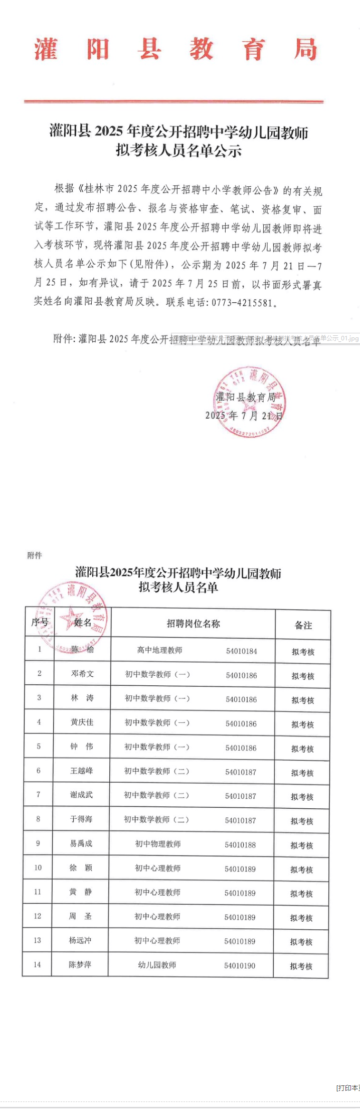 灌陽縣2025年度公開招聘中學幼兒園教師擬考核人員名單公示